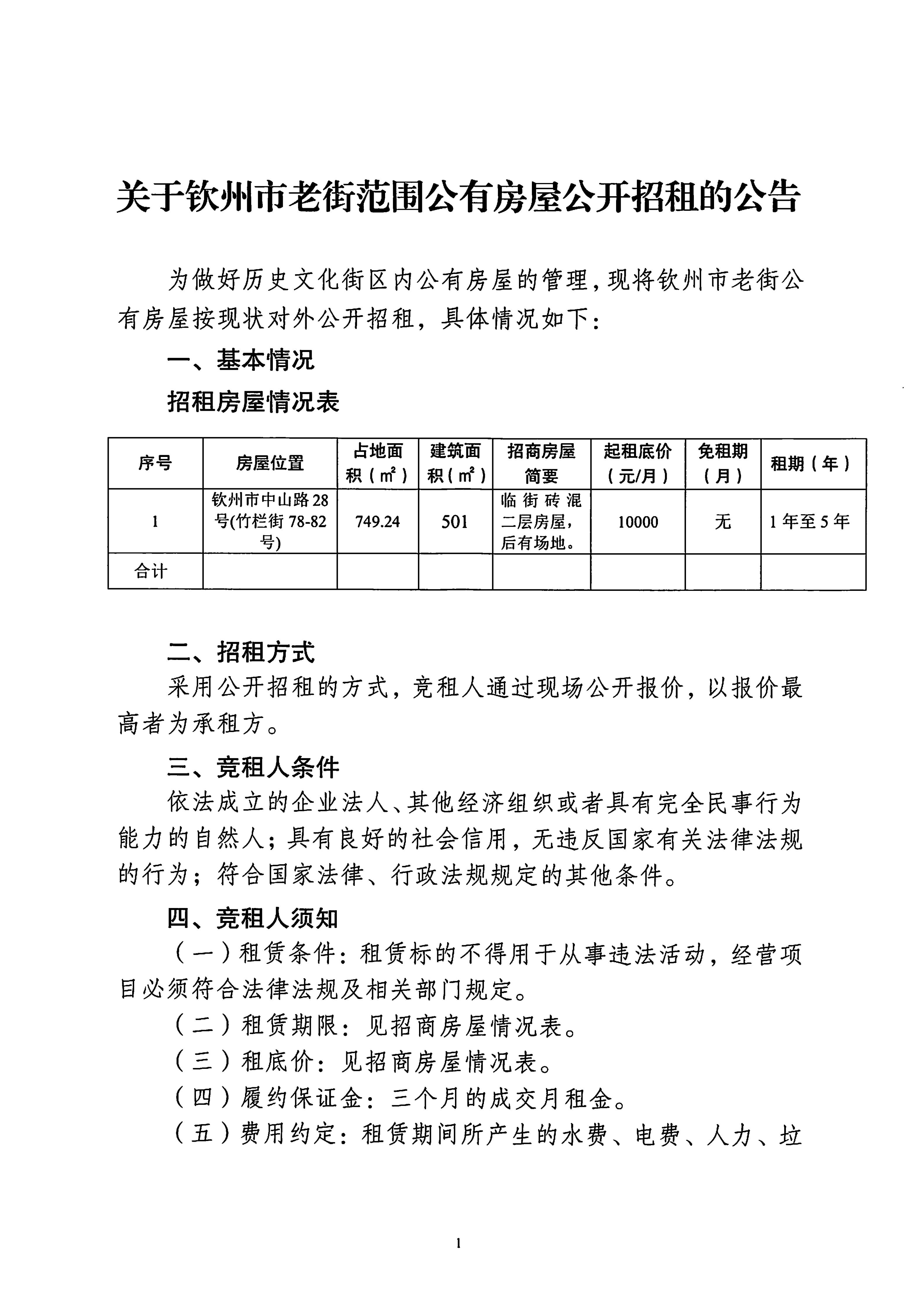 欽州市中山路28號(hào)竹欄街78-82號(hào)房屋公開招租公告