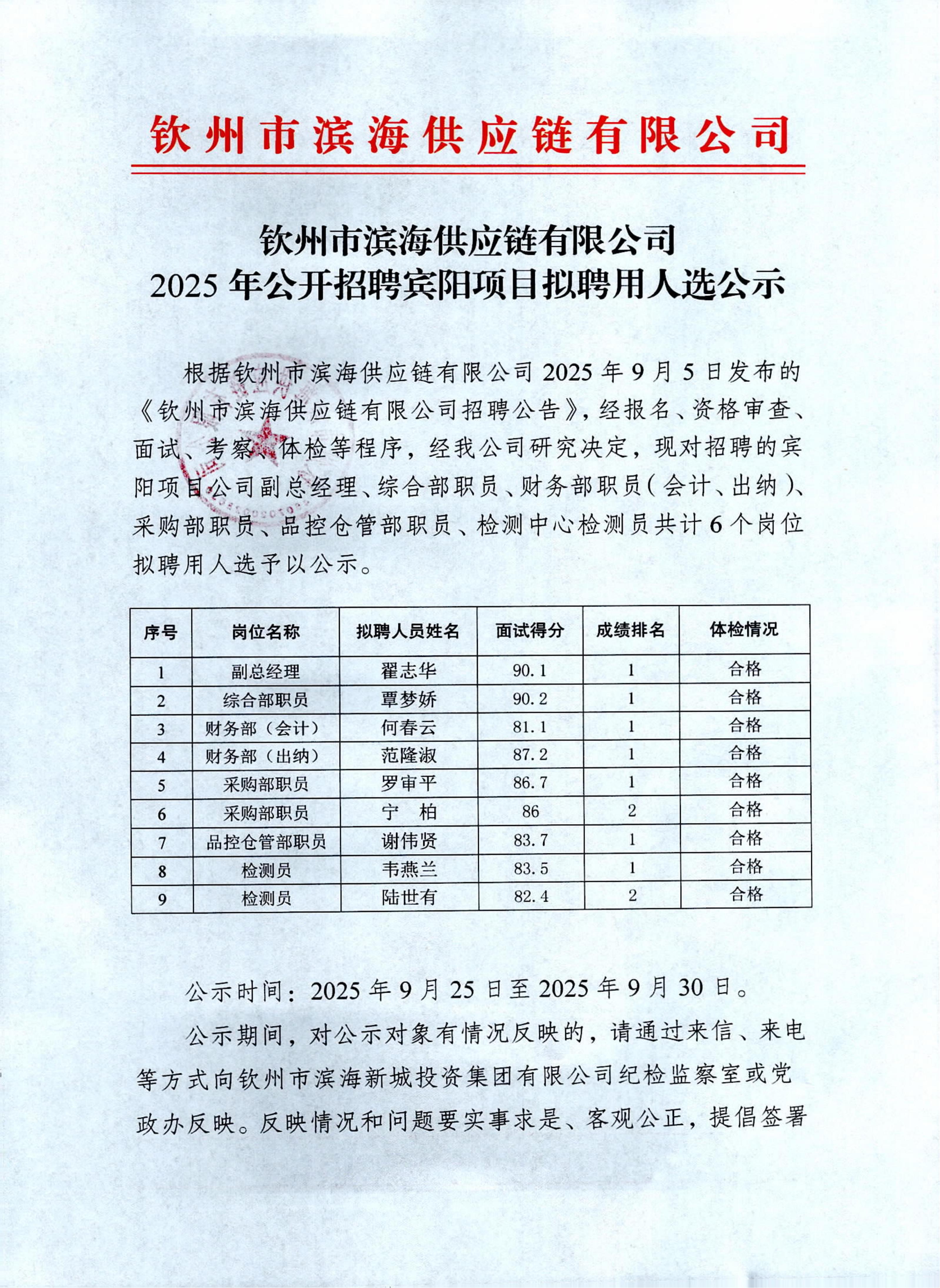 欽州市濱海供應鏈有限公司2025年公開招聘賓陽項目擬聘用人選公示 欽州市濱海供應鏈有限公司2025年公開招聘賓陽項目擬聘用人選公示